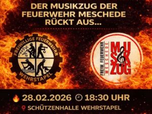 Zum 100 Jährigen Jubiläum der Löschgruppe Wehrstapel spielt der Musikzug das Jubiläumskonzert. Termin: Samstag 28.02.2026 Einlass: 18:30 Uhr Ort: Schützenhalle Wehrstapel Eintritt: 10€ Vorverkauf : – Gasthof Frischemobil Dröge in Eversberg – Elektro Kramer, Am Kreishaus 10 in Meschede